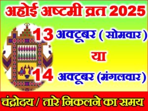 Ahoi Ashtmi Kab Hai 2025 Mein   अहोई अष्टमी व्रत कार्तिक माह में कृष्ण पक्ष की अष्टमी को रखा जाता है इसे अहोई आठे भी कहते है। इस व्रत को पूरा दिन निर्जल करने की मान्यता हैं। शास्त्रों के अनुसार इस दिन अहोई माता का पूजन और रात में तारों को देखकर पारण किया जाता हैं. अहोई अष्टमी के दिन गोवर्धन में राधा कुंड स्नान भी किया जाता है. आइये जानते है साल 2025 अहोई अष्टमी व्रत कब है 13 या 14 अक्टूबर, पूजा का शुभ मुहूर्त, चंद्रोदय और तारे निकलने का समय, पूजा विधि और इस व्रत में क्या करे क्या न करे|